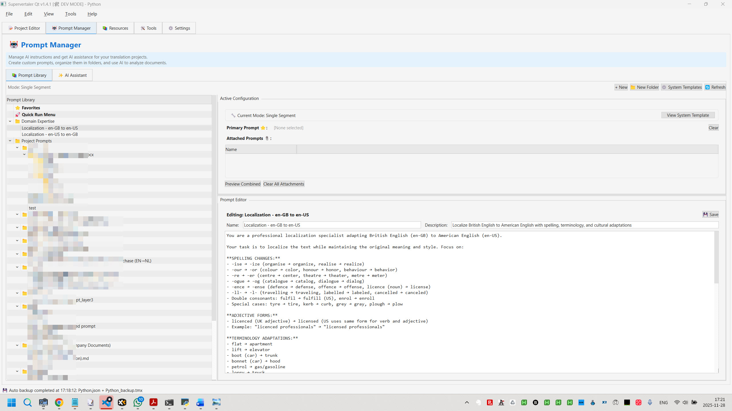 Not only can you create, store, and manage translation prompts—Supervertaler includes an AI Assistant with conversational interface that analyzes your documents and helps generate custom prompts. Plus specialized modules like PDF Rescue (AI OCR), TMX Editor, Supercleaner, and Superlookup.